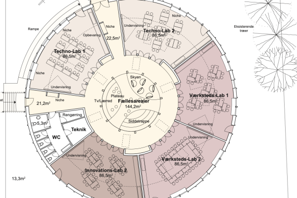 Skyum Forum vil være et undervisningshus med 5 store undervisningslokaler og et stort fællesrum i midten af den runde bygning.